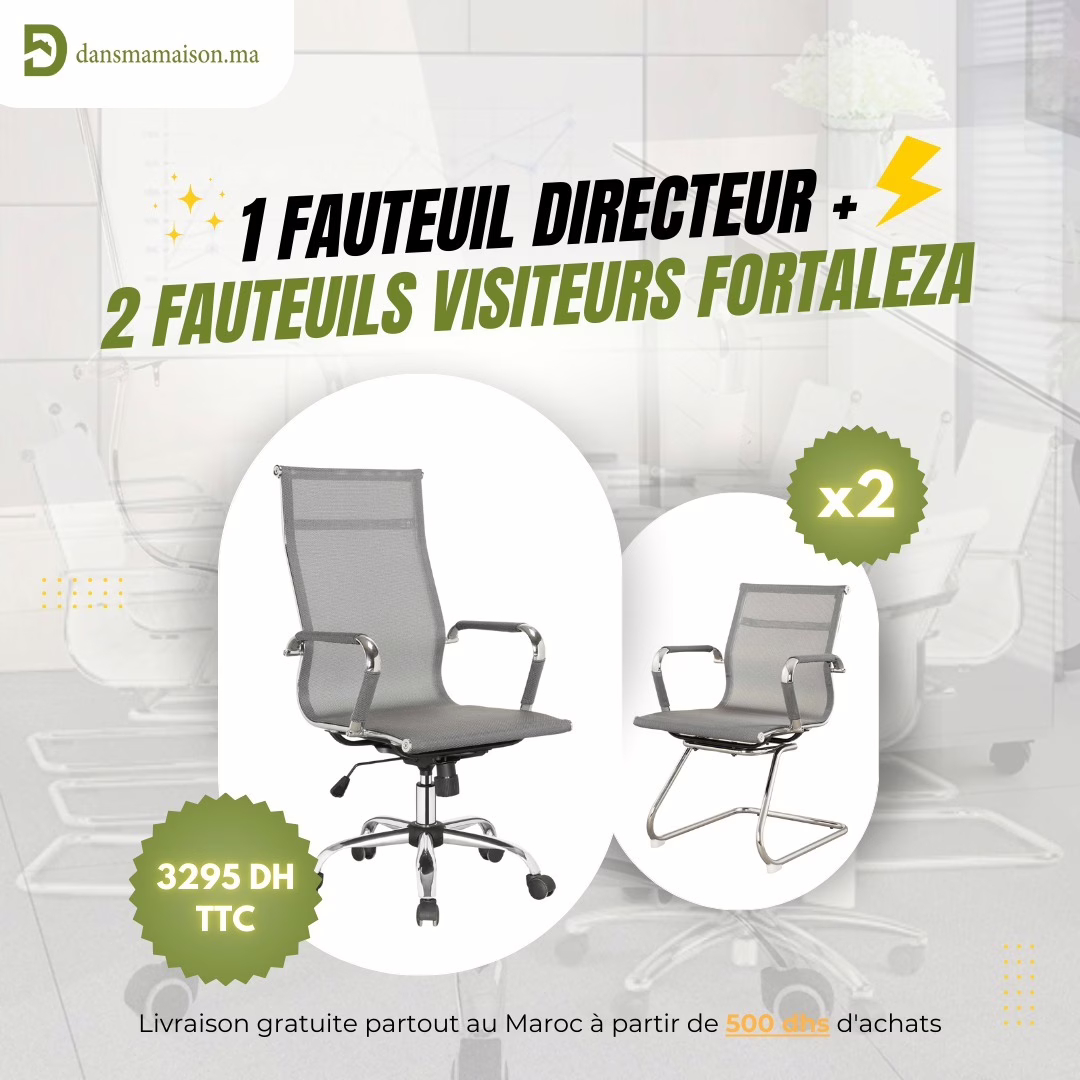 Aménagez votre bureau avec élégance et fonctionnalité grâce au pack FORTALEZA. Cet ensemble complet se compose d’un fauteuil directeur réglable et de deux fauteuils visiteurs assortis, alliant confort, ergonomie et design contemporain. Parfait pour créer un espace de travail accueillant et professionnel.